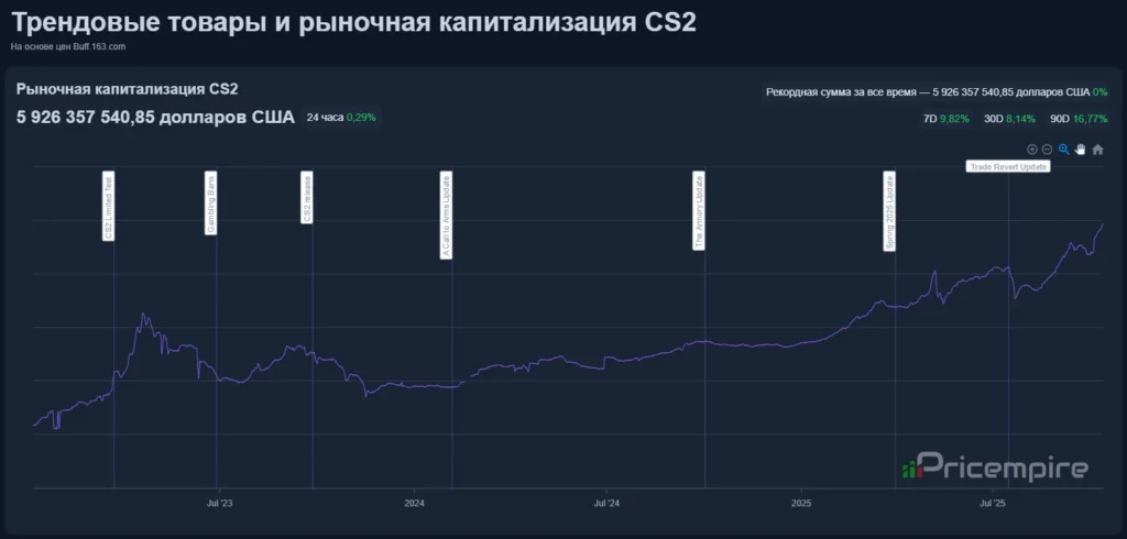 По данным сайта pricempire, рынок предметов в КС, на момент написания статьи, достиг 5,9 млрд вечнозеленых, это стало абсолютным рекордом, за всё время. Причём рынок продолжает расти